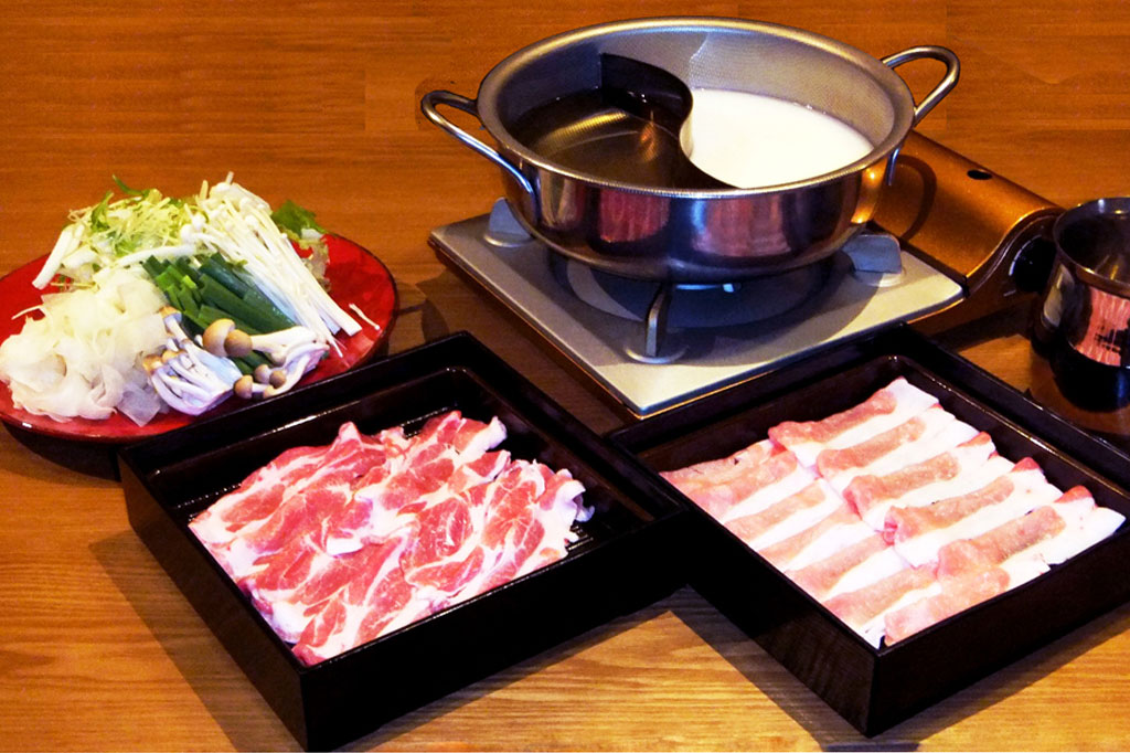 だし汁は「かつお」「昆布」「豆乳」から選ぶことができ、豚しゃぶ以外にも国産牛しゃぶしゃぶや鴨鍋も楽しめる。