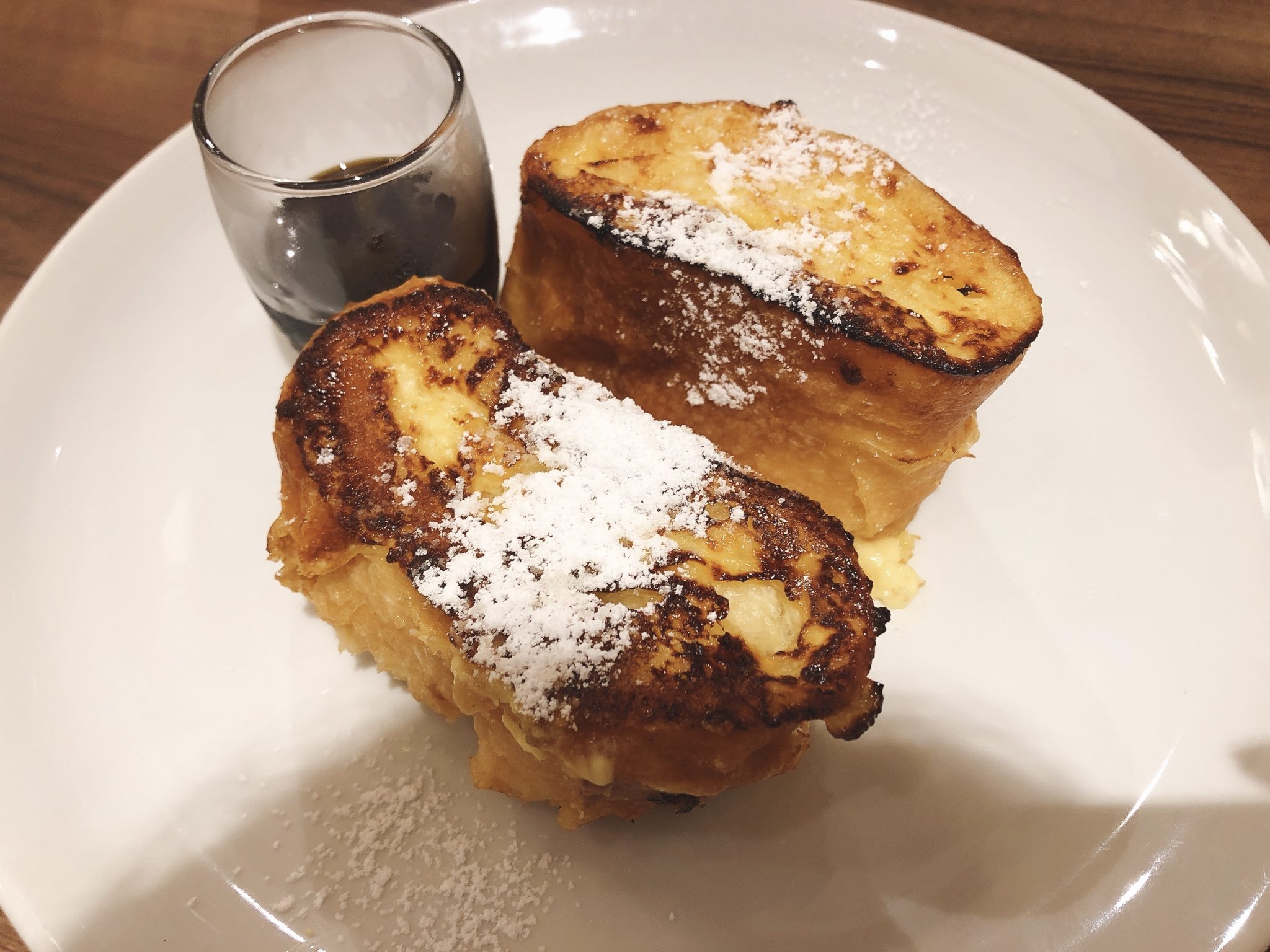 一番人気はリコッタパンケーキだと思いますが、私はフレンチトーストが好みです。ソースを5種類くらいから選べ、分厚くカットされたバケットによくアパレイユが染み込んでいます。外かり中ふわタイプで、ボリュームもあります☺︎