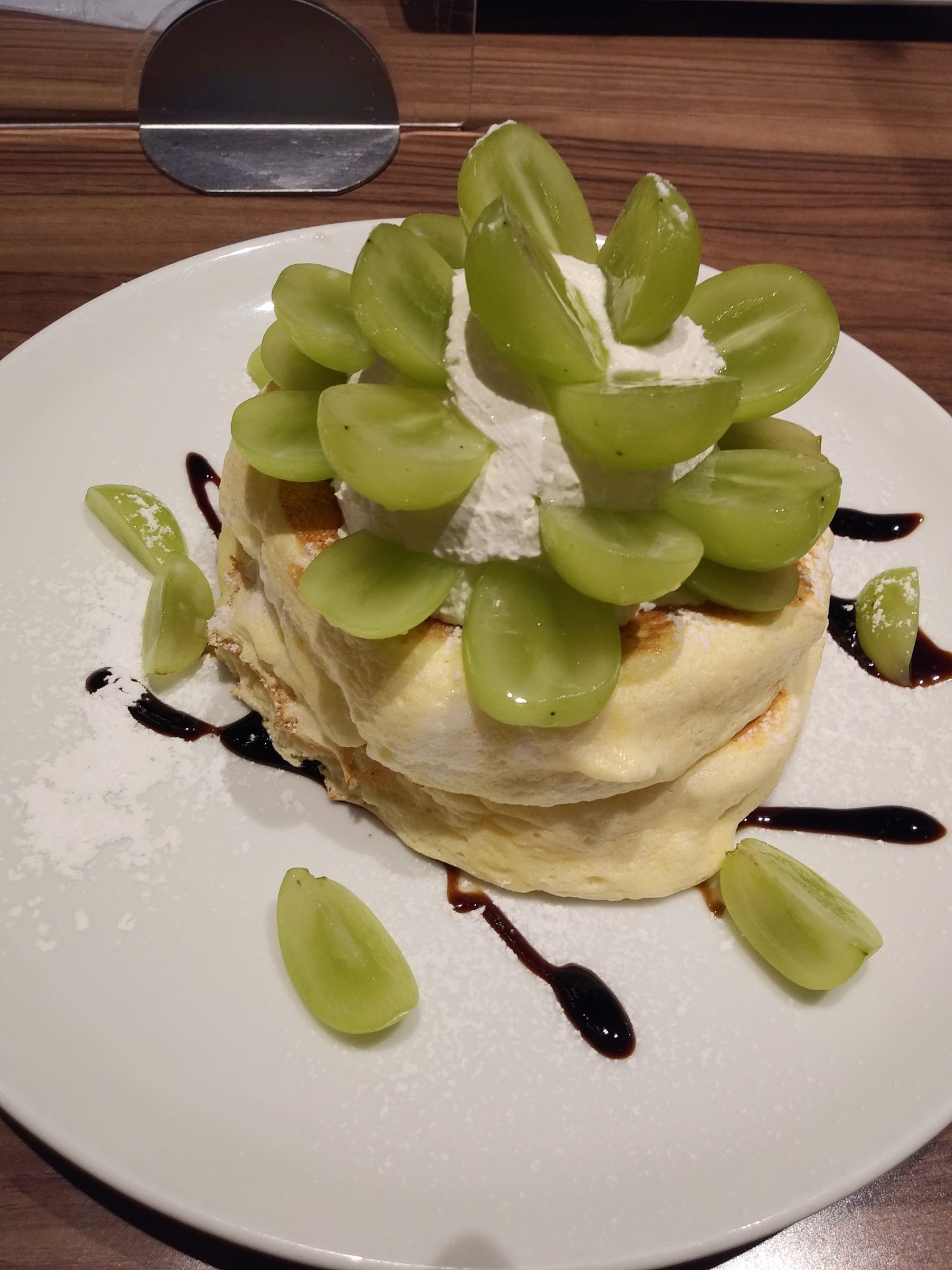 高倉町珈琲のリコッタパンケーキを、とーっても久々に食べました。期間限定のシャインマスカットのリコッタパンケーキがあったので、迷わずそちらを注文。山梨県産のシャインマスカットをふんだんに使っています。ふるふるの柔らかいパンケーキは、レモン汁の酸味がとっても効いていて、高倉町のパンケーキはこんなに酸っぱかったっけ?と思ってしまいました。でもトッピングされたマスカルポーネチーズにもレモン汁の酸味が効いていたので、この商品はシャインマスカットに合わせて酸味を効かせているのだと思いました。ビジュアルも良くて、美味しかったです。期間限定なので、このパンケーキを食べたい方は早めに行くと良いと思います。