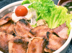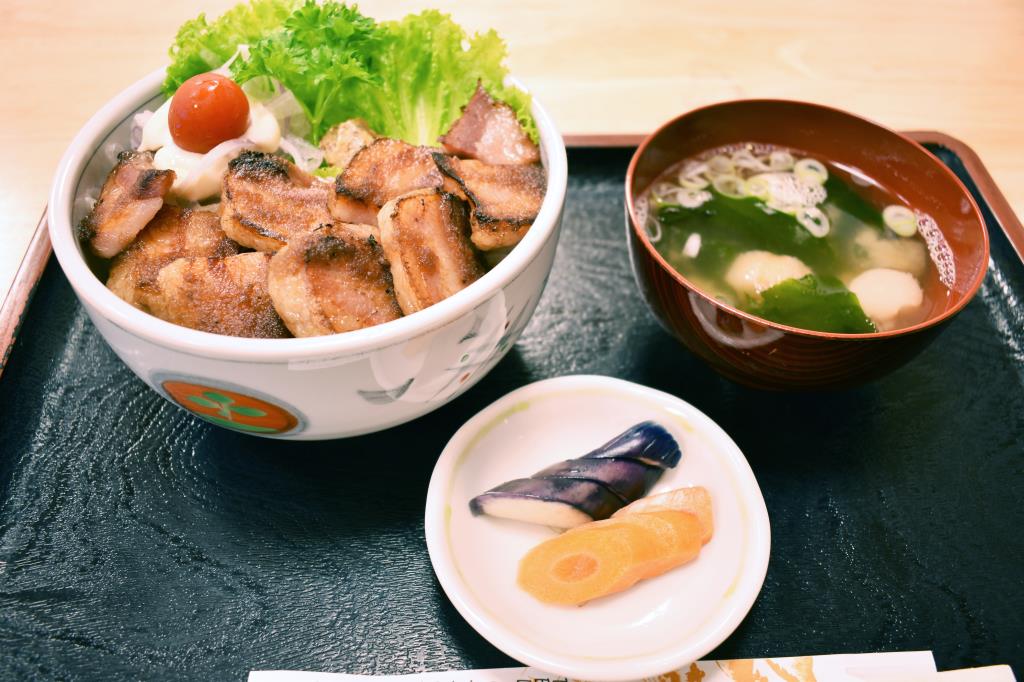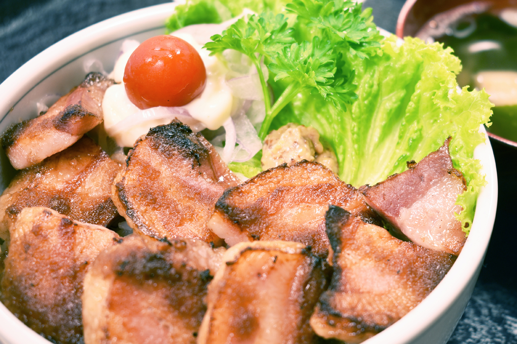 自家製のベーコンをたっぷり使ったどんぶりや、早川の白鳳味噌を使ったほうとうを味わえる。