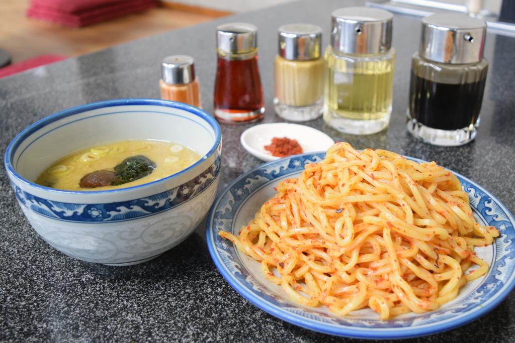 店長のオススメは辛味つけ麺!とうがらし3種類、砕いたエビ、ニンニク入りラー油で和えたオリジナル中太麺と醤油豚骨魚介スープの相性は抜群!!