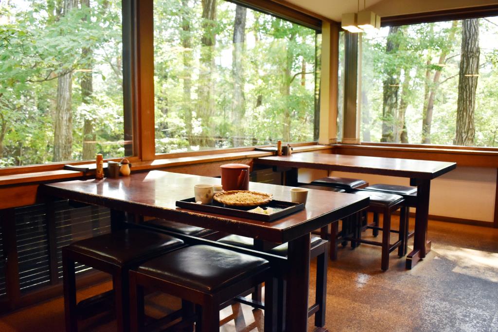 店内からは緑豊かな景色を楽しめ、職人が作るそばの味わいも増す。