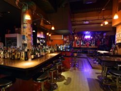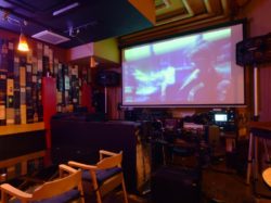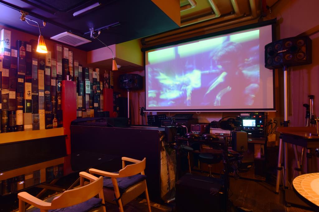 店内には大型スクリーンが設置され、カラオケが楽しめるようになっている。