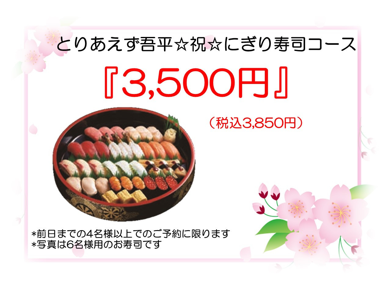 春の陽気を感じる時期となりました! 歓送迎会、お祝い事のお客様が増えております! 今回はお得なコースのご紹介です🎵 『にぎり寿司コース』 ☆3,500円(税込3,850円)☆ ...
