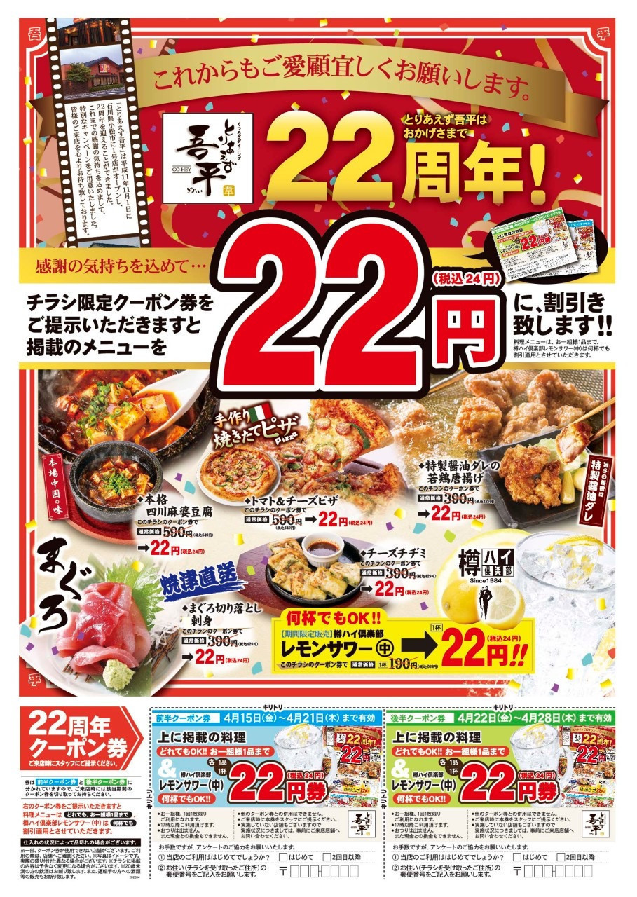 こんにちは! とりあえず吾平 甲府竜王店です🎵 本日よりスペシャルイベントのスタートです! 皆様のおかげで22周年!!! ありがとうございます! 4/15(金)~4/28(木)期間限...