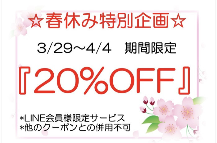 3月22日迄の期間限定クーポン! 店頭のポップよりLineのおともだち登録をお願いします。 登録後、PORTAさんの画面を店員まで提示してください。 Line配信ではお得なクーポンを随時配信して...