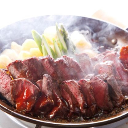 切り分けたミスジを高温の油で表面を一気に揚げ焼し肉の旨味を閉じ込めました!
