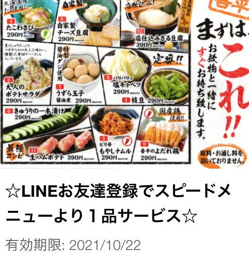 店頭にてLINEお友達登録頂いたお客さには「スピードメニュー1品」サービス致します。