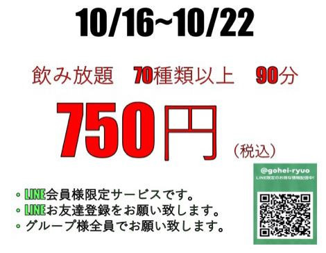 70種類以上・90分/750円の飲み放題コース LINEお友達登録頂いているお客様限定! ※LINE登録して頂き、PORTA画面ご提示いただけばご利用頂けます。 10/16(土)~10/22(金...