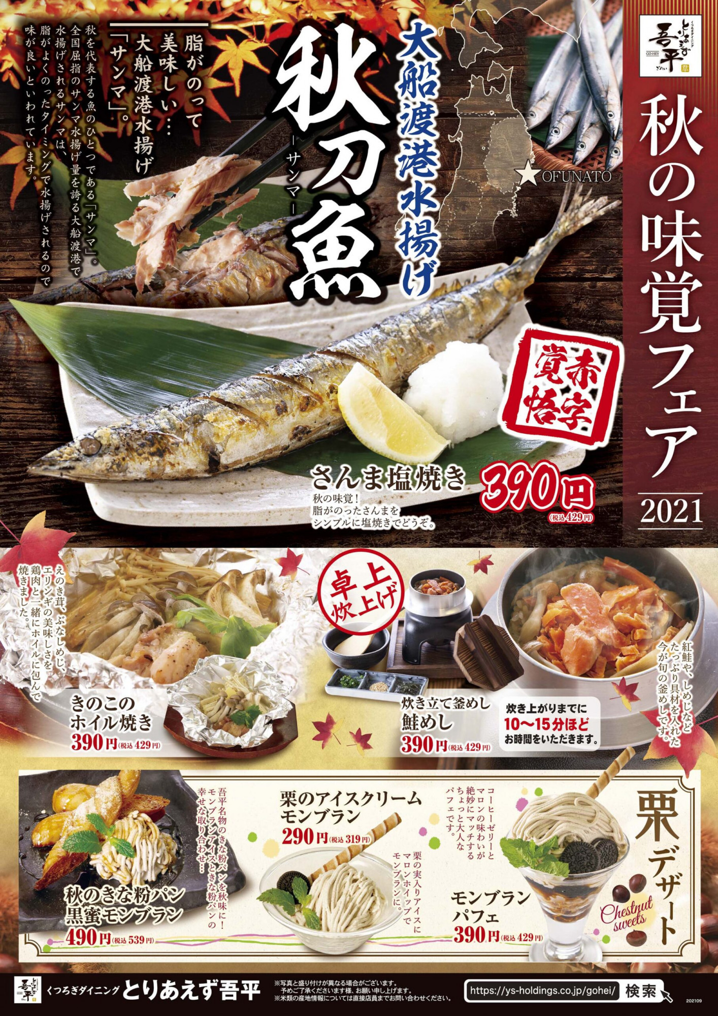 秋といえば、もちろん食欲の秋 吾平では旬の食材を使用したメニューをご用意しました 脂がのって美味しい・・・大船渡港水揚げのさんまを使用した「さんま塩焼き」 きのこの美味しさを詰め込んだ「きのこの...