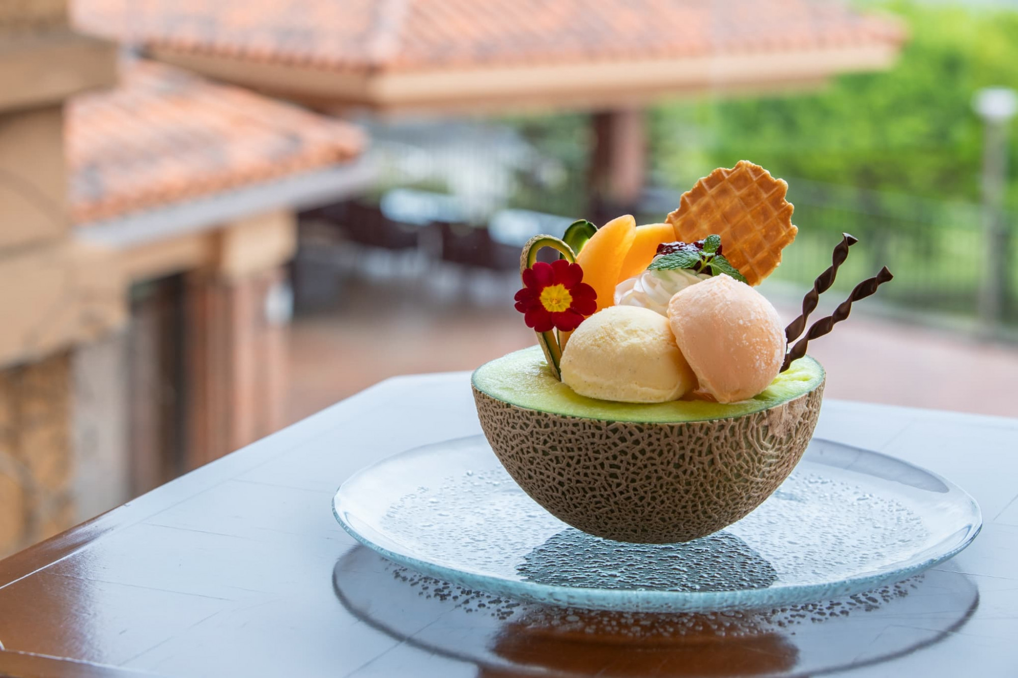 器に見立てた半身のメロンの上に赤肉メロンと2種類のアイスを可愛らしくトッピング。さらにメロンジュレが隠れているのでこのパフェを食べれば食べるほどメロンに恋してしまいます。