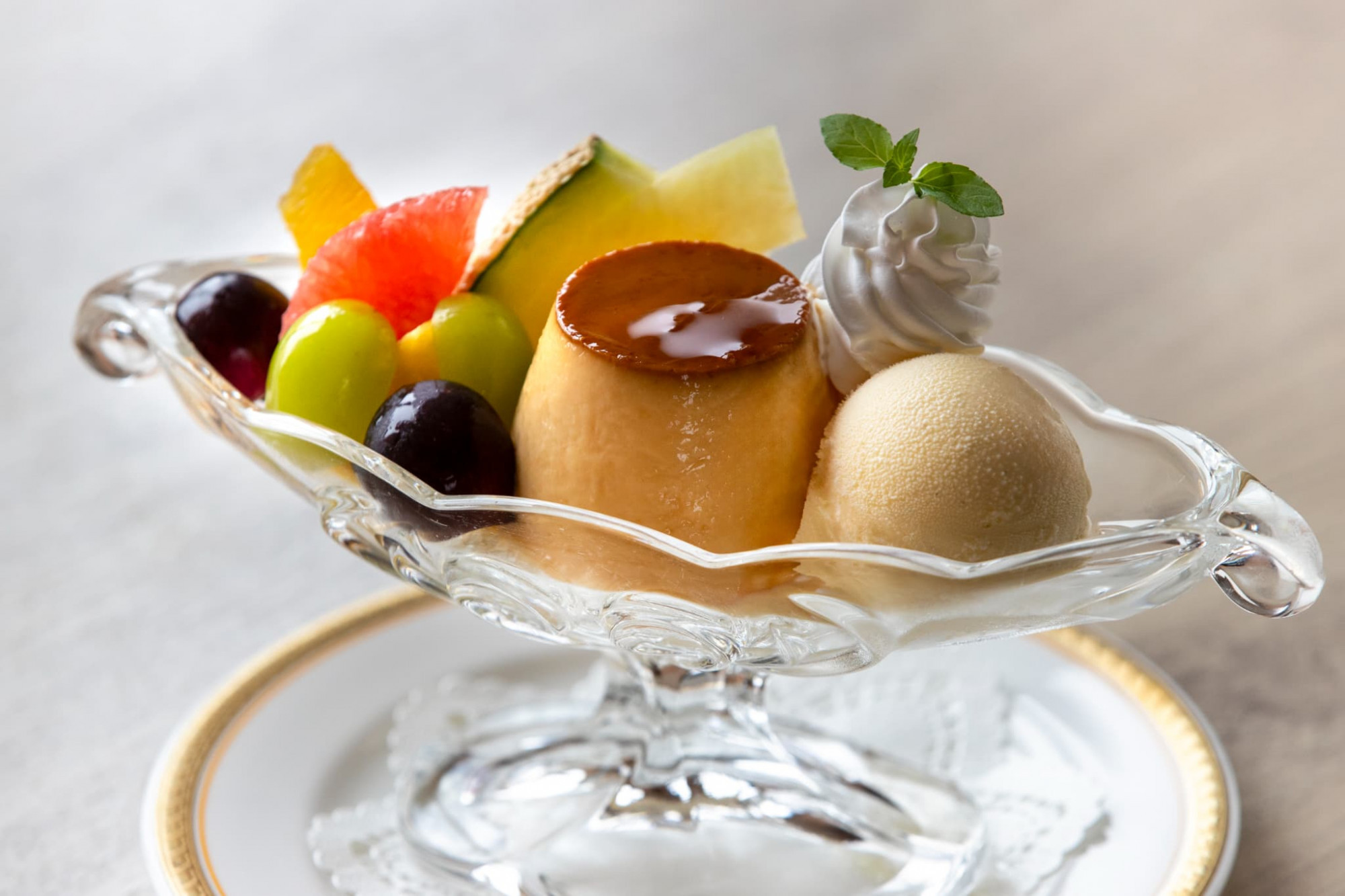 生クリームを加えることにより生まれるコクと濃厚な味わい、ほどよい柔らかさが特徴の自家製プリンと相性抜群のバニラアイス、彩り豊かなフルーツがレトロ感漂うガラスの器で共演。見ているだけでもうっとりしてしまうデザートです。