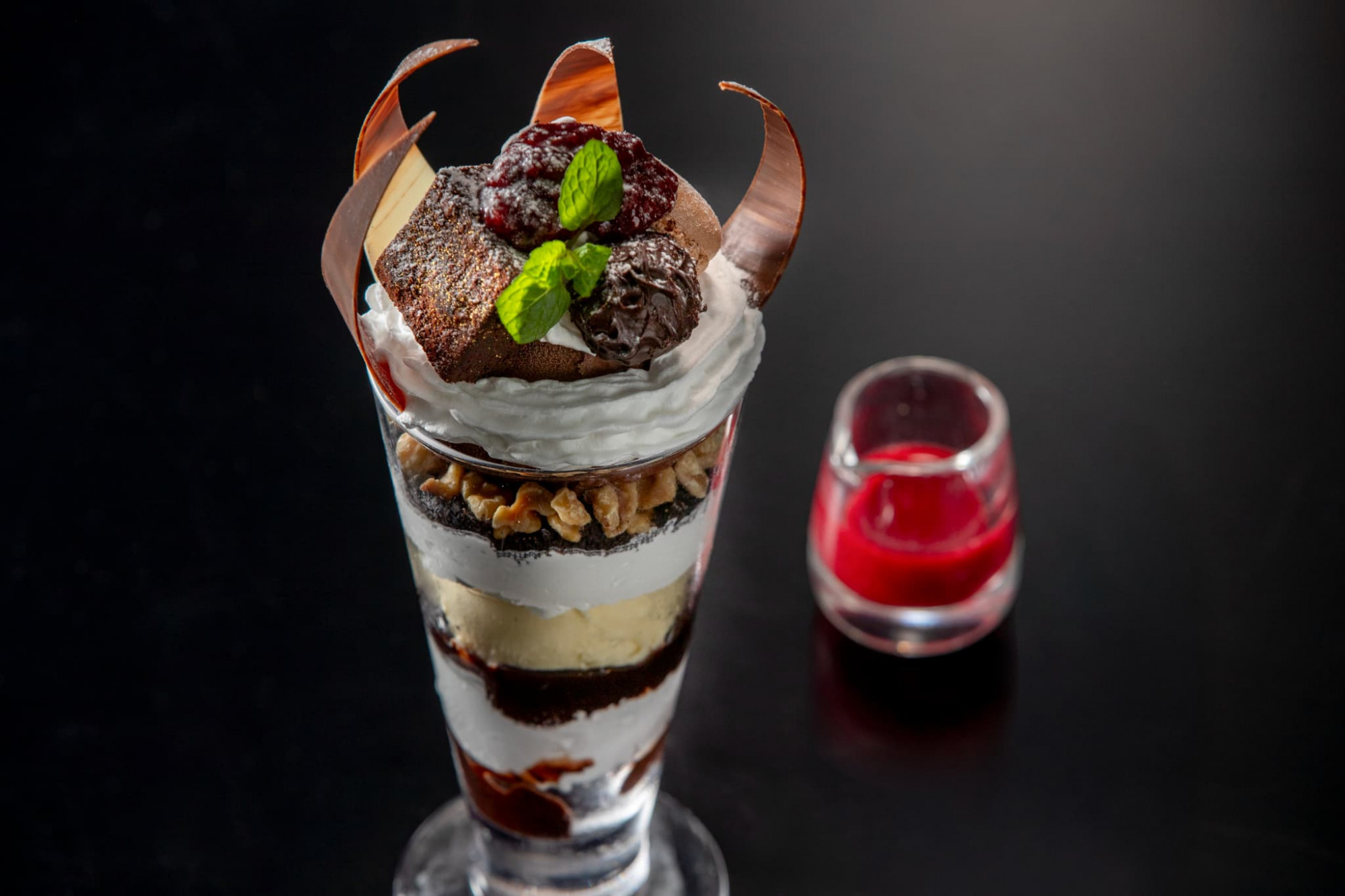 思わず手でつかみたくなるマカロンやトリュフチョコをトッピング、おいしさのポイントはほろ苦いビターチョコレートアイスの下に隠れているクルミの食感。さらにガトーショコラを贅沢に使っているのでチョコレートのおいしさを満喫できる自慢のパフェです。もうひとつのポイントは甘さに飽きないように別添えのラズベリーソースで味変して楽しめることです。