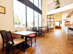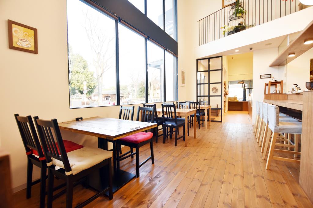 万力公園正面に位置する、天井が高い開放的なカフェ。