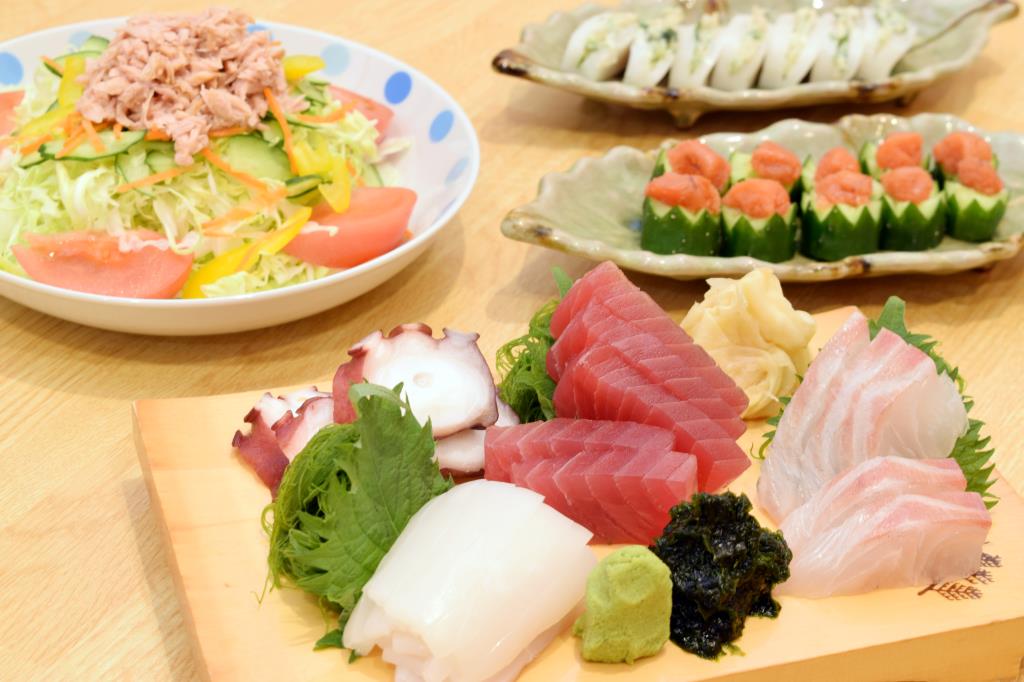 ・ツナサラダ ・板わさ ・お刺身5点盛り ・おしんこ ・明太きゅうり ・もつ鍋(3~4人前) |