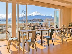 河口湖自然生活館内にある、湖・庭園・富士山を眺めながら食事やティータイムを楽しめるCAFE。
