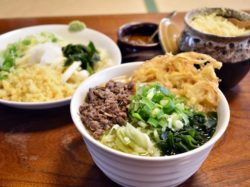 吉田のうどんの特長である馬肉を使った肉うどんに、お好みのトッピングをプラスして召し上がれ!