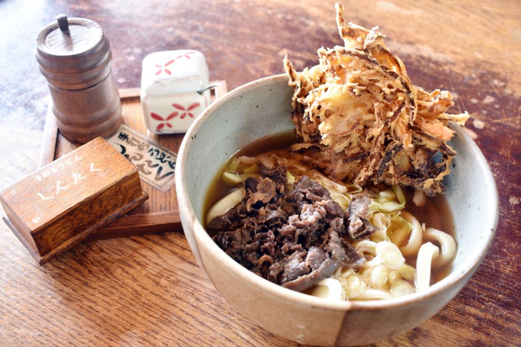 吉田のうどんの特長である馬肉を使った肉うどんに、お好みのトッピングをプラスして召し上がれ!