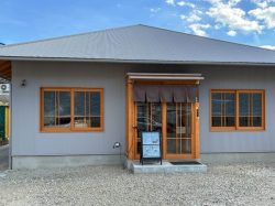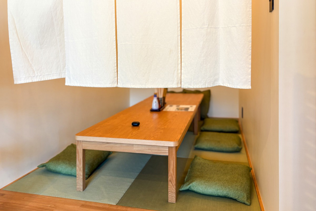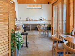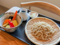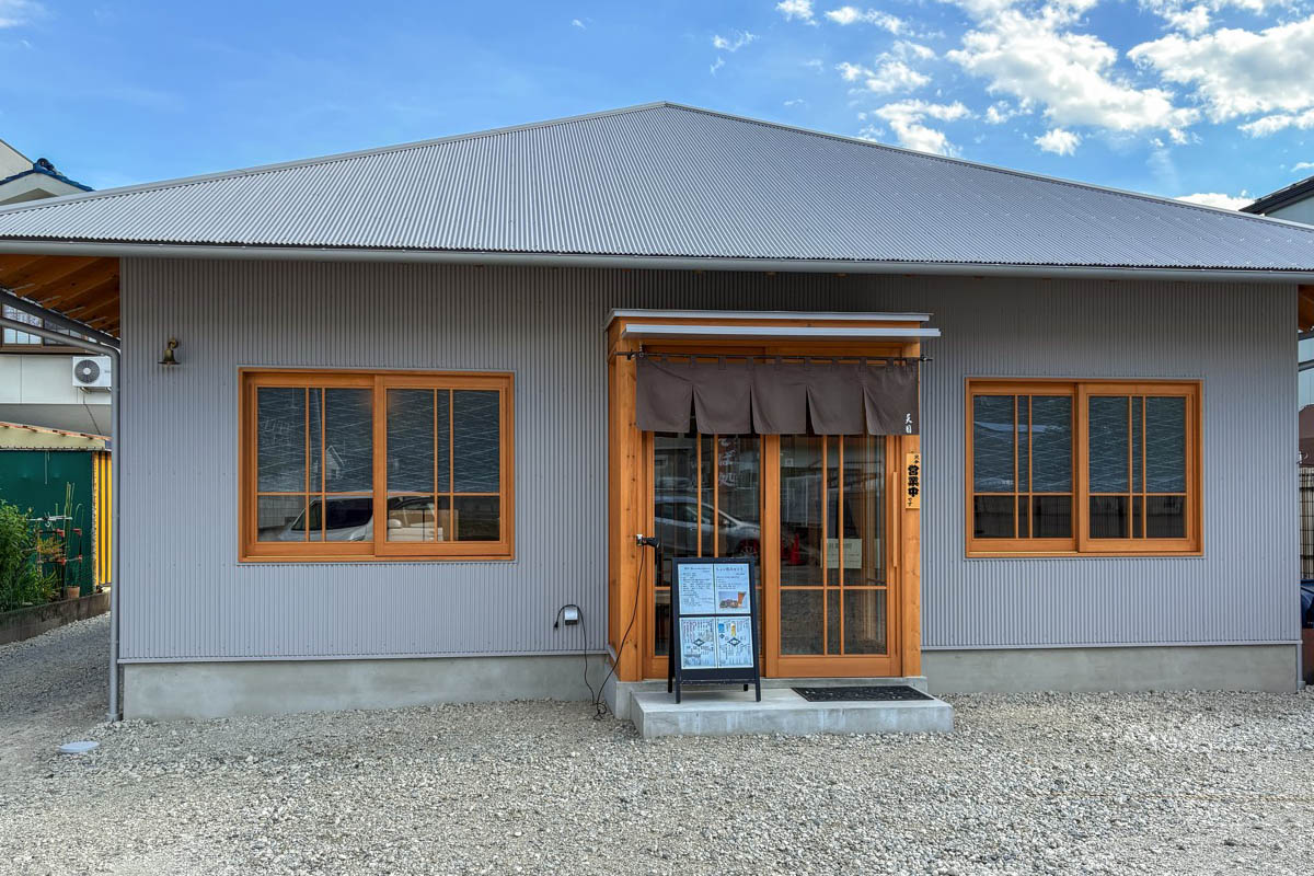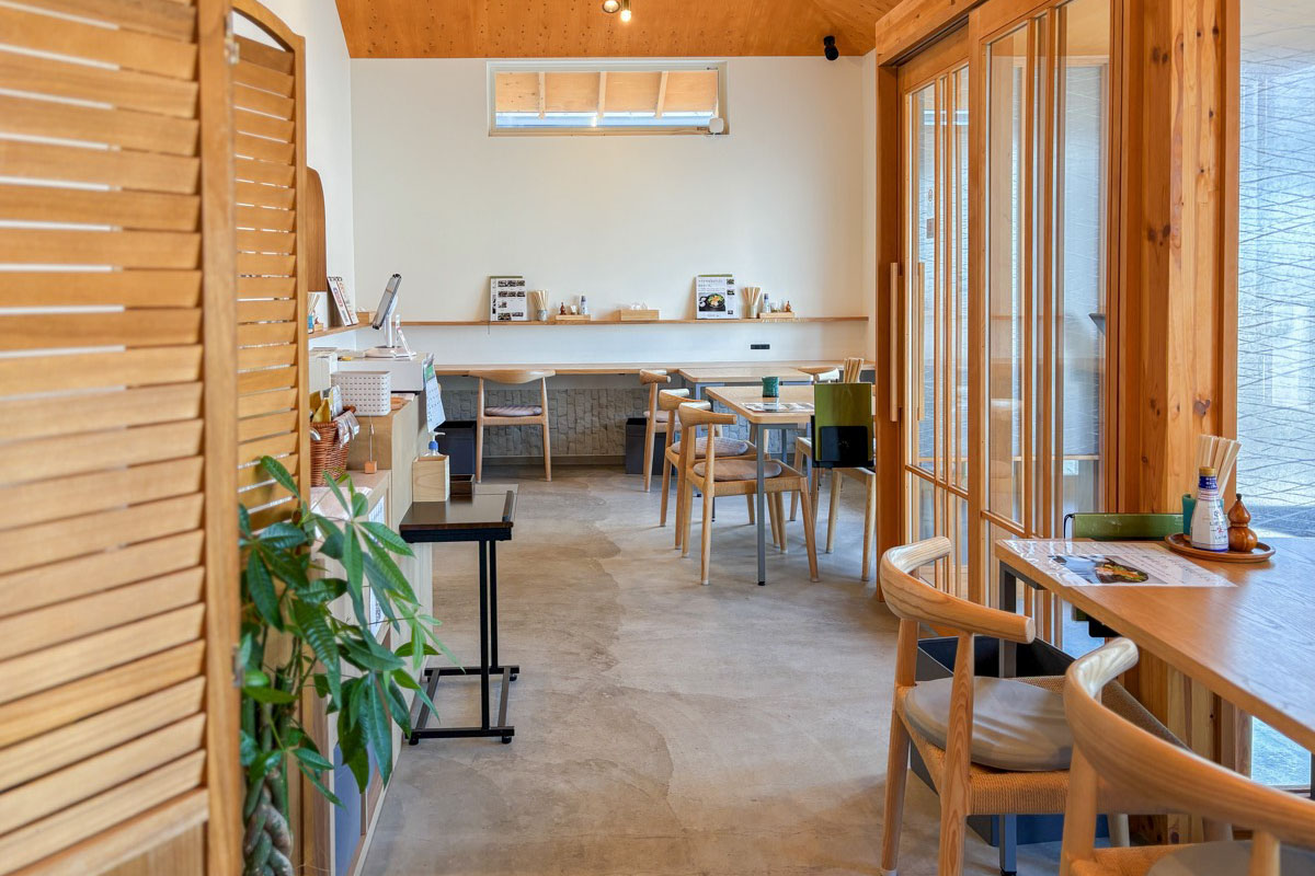 甲府市城東の「そば処天目」は、白と木目が調和した落ち着いたおしゃれなカフェのような雰囲気。