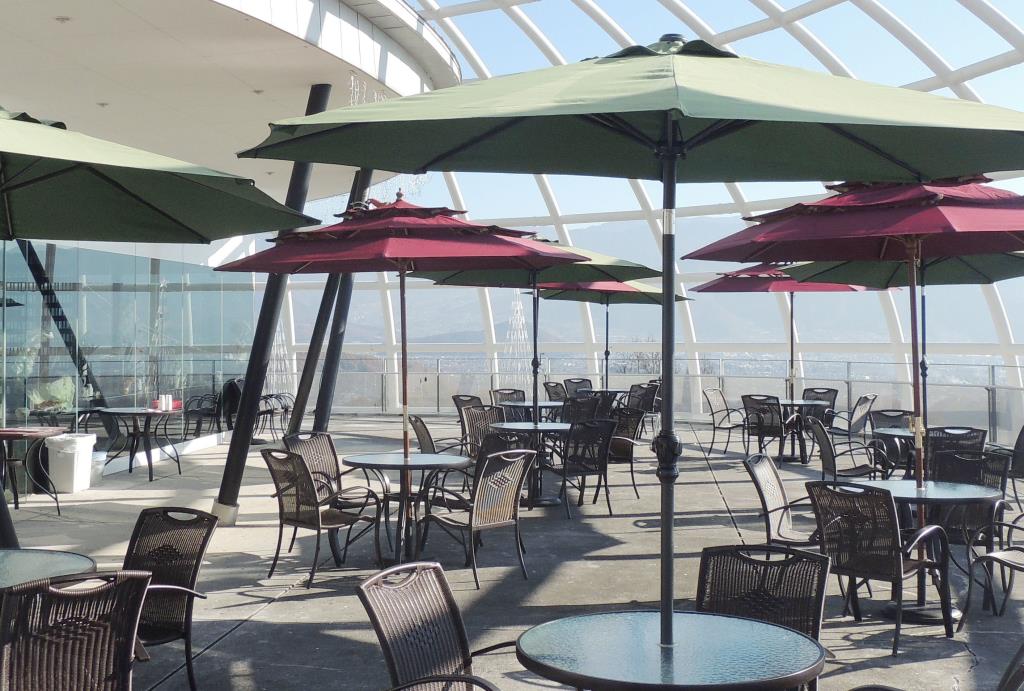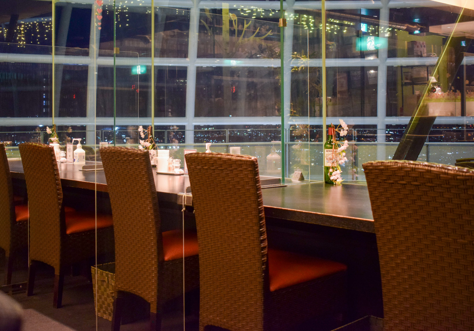昼間は雄大な富士山、夜はきらめく甲府盆地の夜景と昼夜問わず美しい景観の中で食事を楽しむことができる。