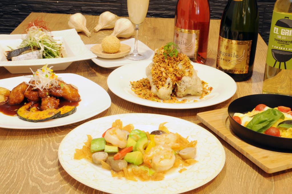 ・毛沢東スペアリブ 980円 ・エビチリ 880円 ・玉子・トマト・モッツアレラチーズのバジル炒め 800円 ・鰆蒸しの香港醤油がけ 880円 ・杏仁プリンとゴマ団子 390円 ・女子会コース 3,800円(料理7品+飲み放題2h) |