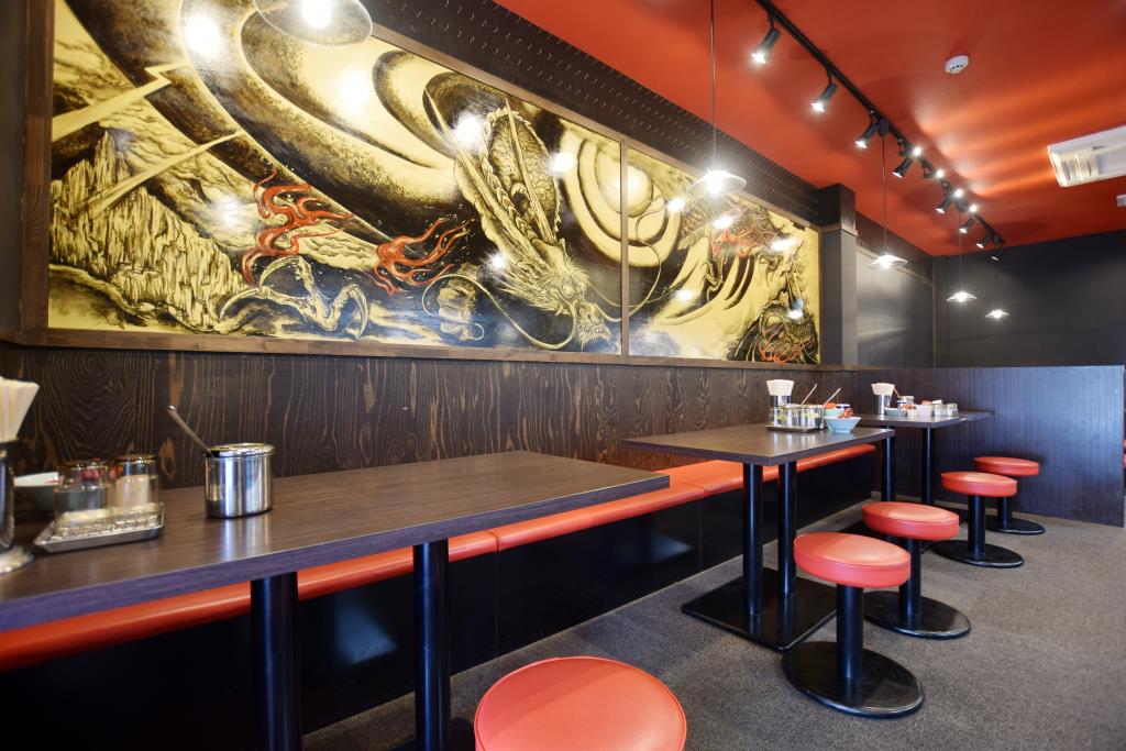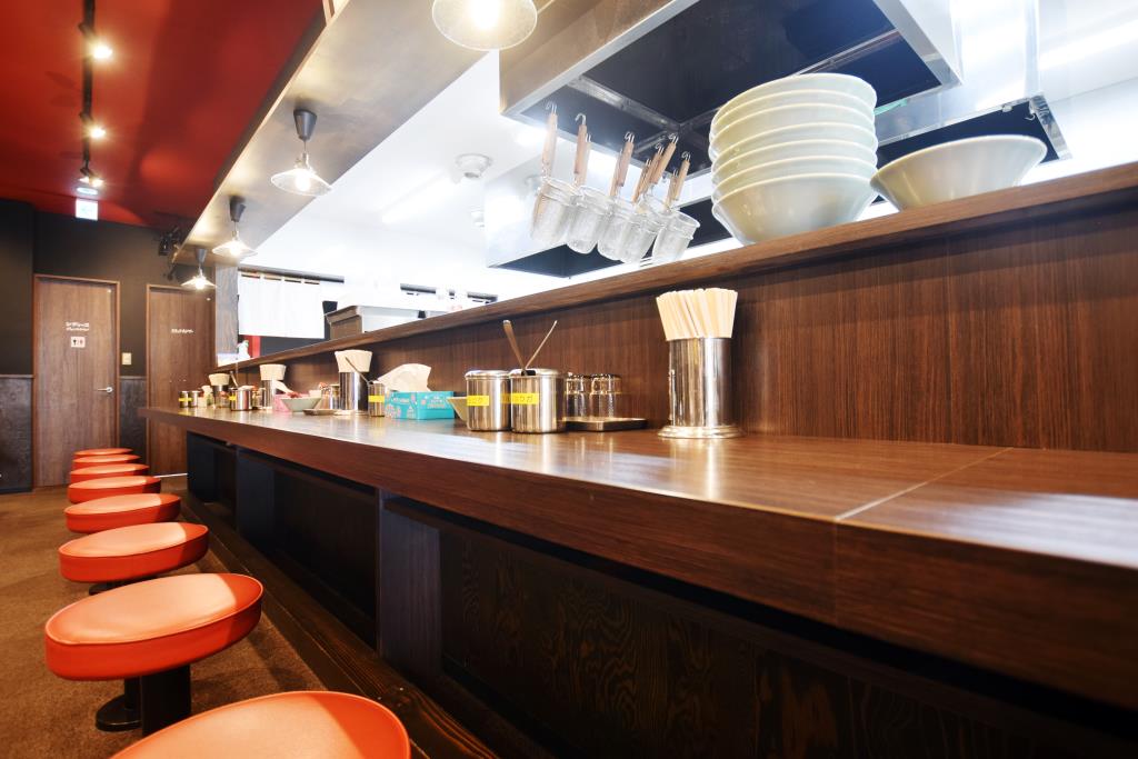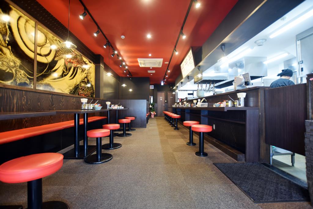 駐車場完備、カウンターとテーブル席がある広めの店内。子供連れのファミリーもゆったり…