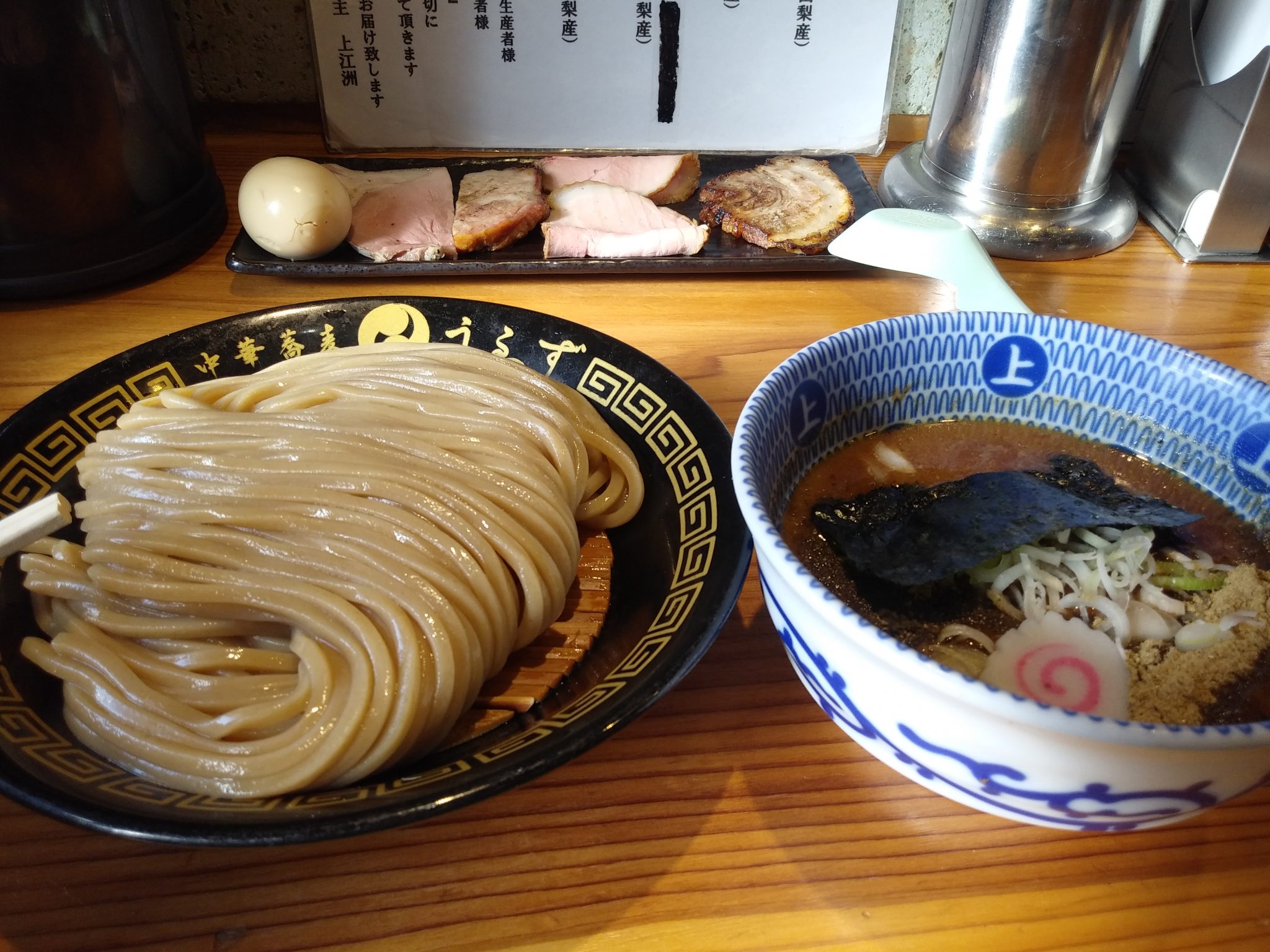 叉焼4種類と煮卵が付いたつけ麺を注文しました。
