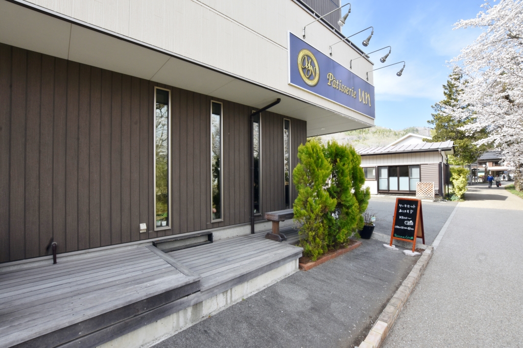 忍野八海近く、小川のほとりに佇むケーキとカフェのお店。