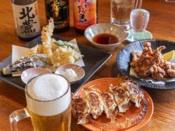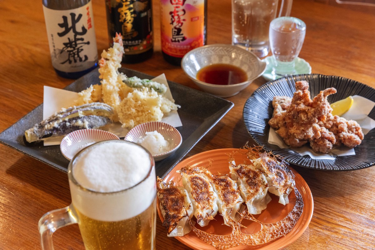 夜は桜姫鶏もものから揚げやジンギスカン、海鮮など豊富で、お酒と料理を楽しめる。