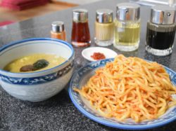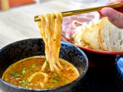 縁者甲府で人気のつけめん屋。店長のオススメは辛味つけ麺!とうがらし3種類、砕いたエビ、ニンニク入りラー油... -