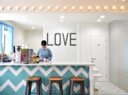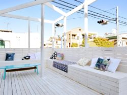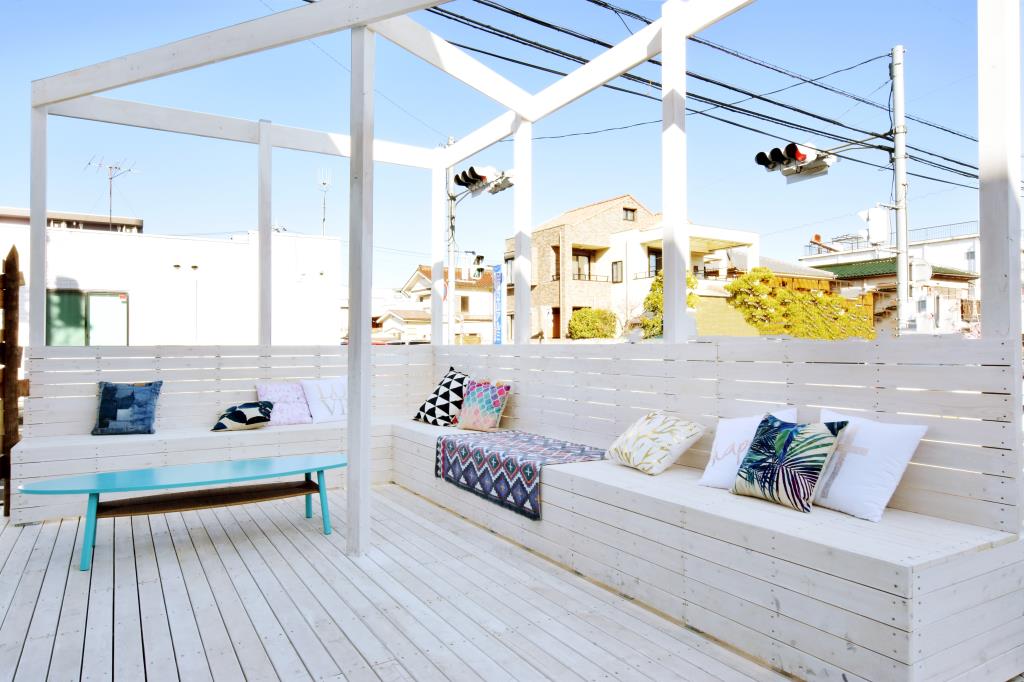 まるでビーチにいるかのようなブルーとホワイトで統一された、オシャレな店内やテラス!