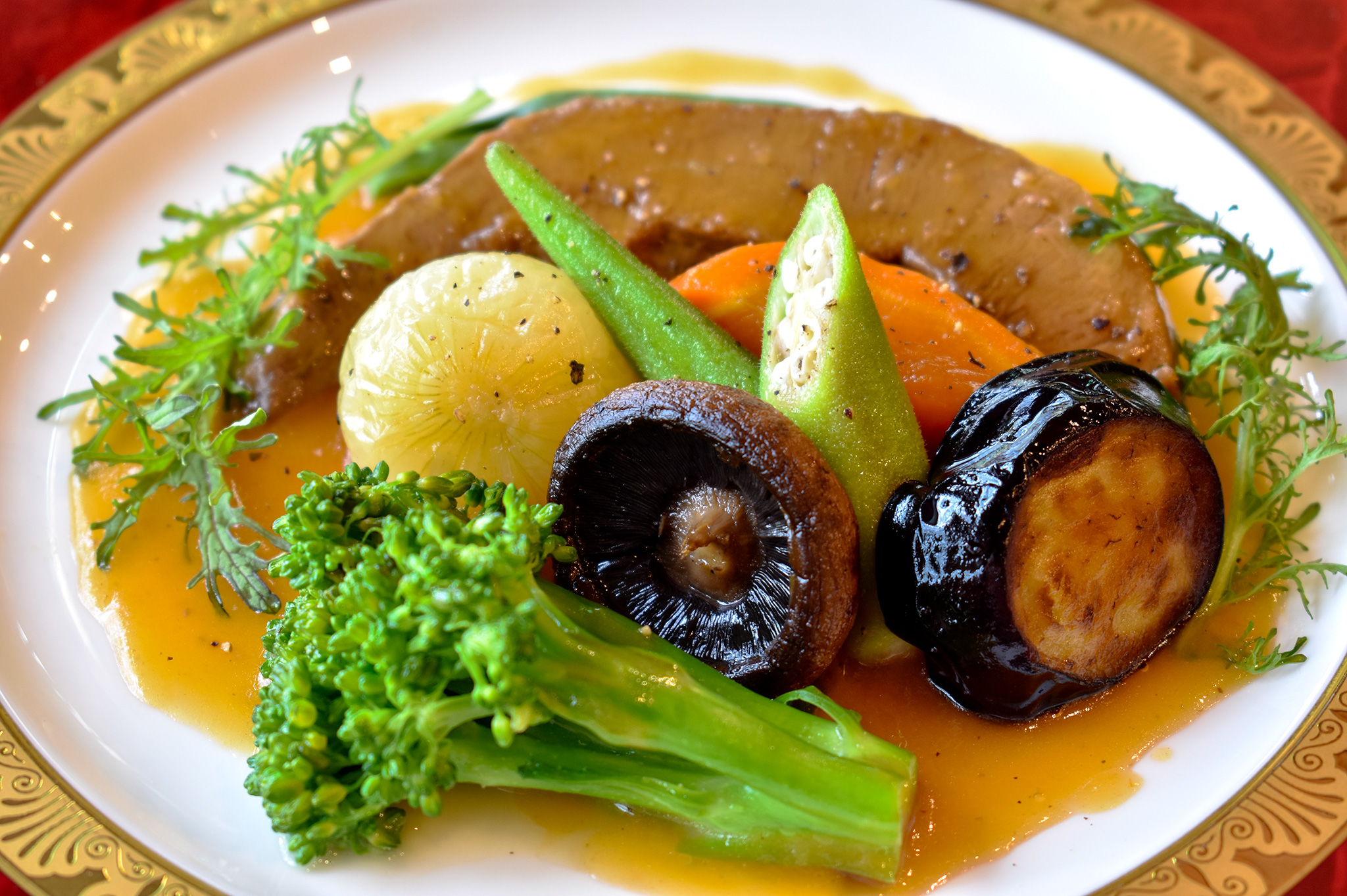 地産地消にこだわり、北杜市の食材の美味しさをふんだんに活かした料理は、長年フレンチに携わるシェフの丁寧な仕事が伝わる。目の前でソースをかけて仕上げるおすすめのクラシックハンバーグは、アツアツジューシー!