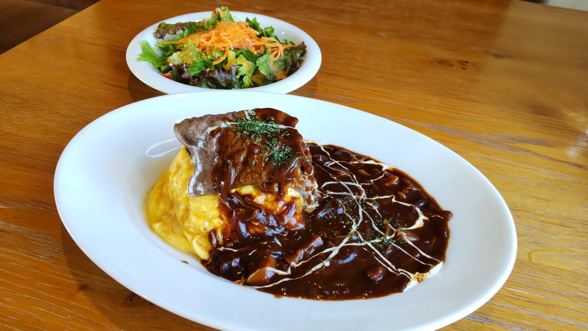 オムライスを食べたくて行ったのですがメニューを見て、どれも美味しそうですごーく迷い、結局はオムライスにしましたが、お肉が乗っていて高級感もあって、一皿で完璧なお味のとても美味しいオムライスでした!ソース最高でした✨何よりお店の方の物腰が柔らかくてとても丁寧で、帰るときにも「もっとゆっくりして頂いて良いんですよ」とにこやかに声を掛けてくださり、仕事で疲れていた私の心に響きとても暖かい気持ちになり、来て良かったと思いました。幸せにしてもらえるお店ですね。また行きたいです。
