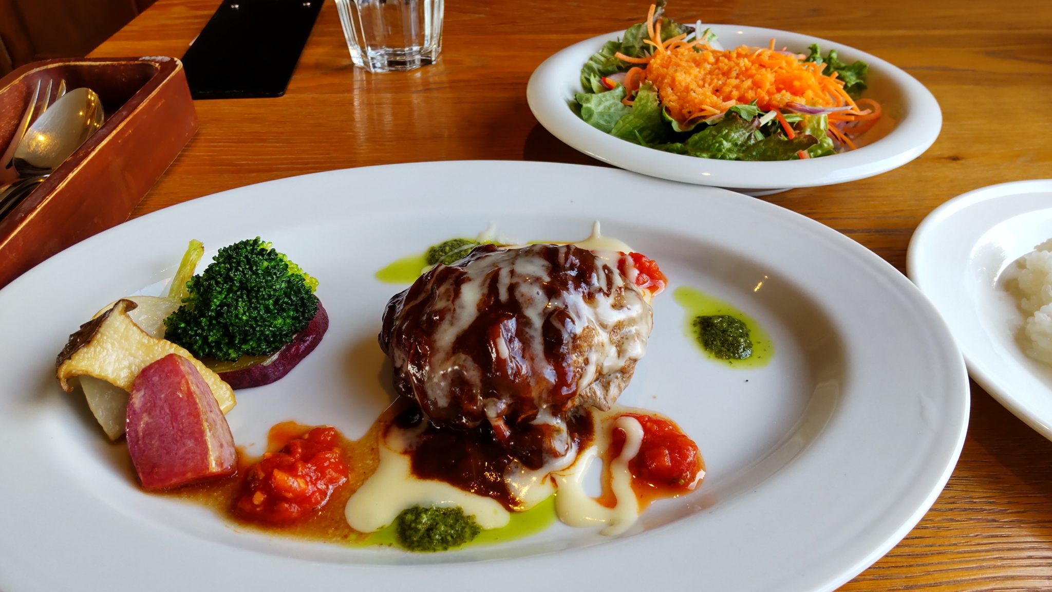 ランチに伺いました。メニューがたくさんあって、信玄鶏や甲州ワインビーフなど素材が良いものが多く何にしようか迷います。今回は2人でいき、冬限定のスープカレーとハヤシオムライスにしましたが、両方とも美味しかったです。サラダとドリンク付きでお得な価格なのも嬉しい!また、男性の店員さんの接客がとても丁寧で、気持ちよく過ごせた事も良かったです。何回も行って色々いただきたいです。