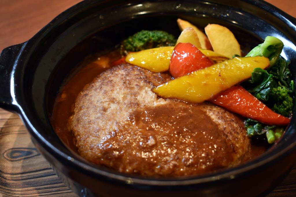 丁寧に土鍋で煮込まれた牛100%のハンバーグは自慢の一品。