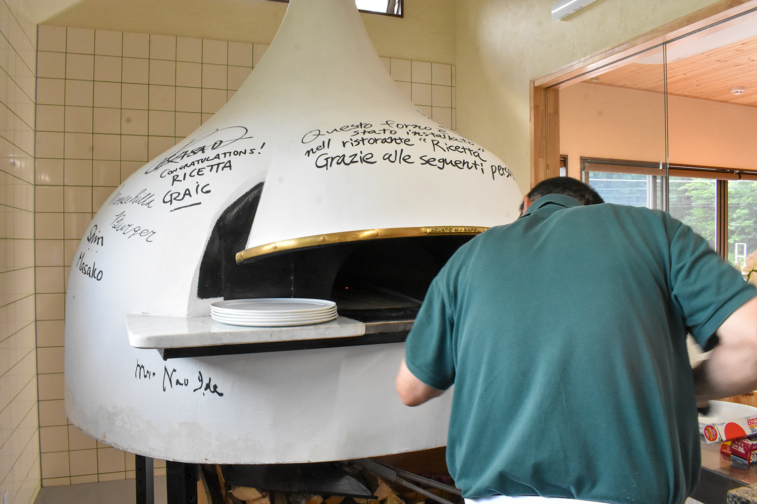 店内は天井が高く解放感があり、窓からは緑豊かな景色を楽しむことができる。リニューアルオープンに伴いピザ窯も新しいものに。リチェッタ看板メニューの薪窯で焼くピザは超がつくほどの絶品。焼き立てのおいしさをぜひ味わってみて。