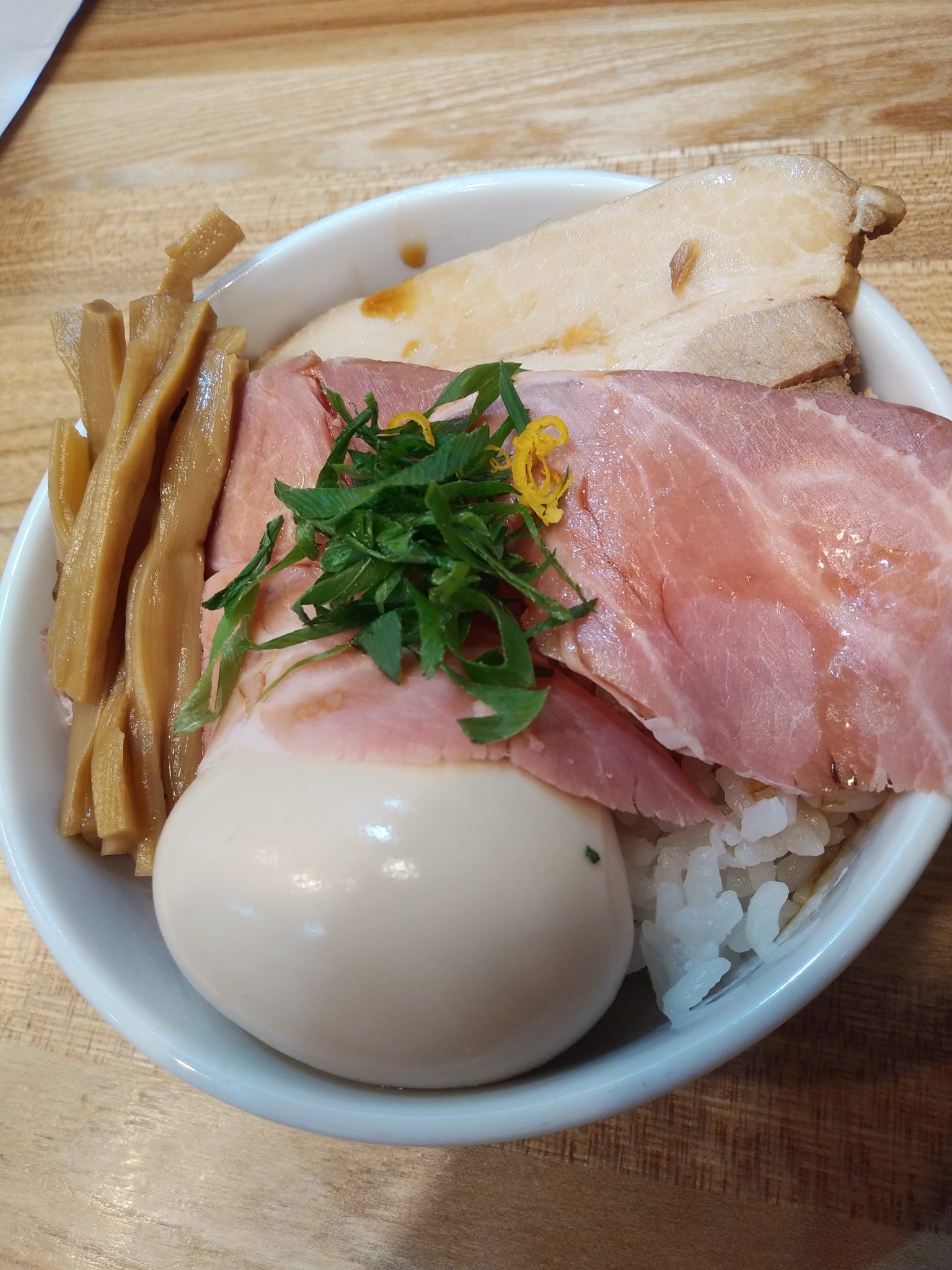 こちらのラーメンはおすすめです。今回はラーメンの他に「虜丼」と言う商品を注文しました。煮卵、レアチャーシュー、バラチャーシュー、メンマがのっていて、ラーメンと一緒だとボリュームあるかなと思いましたが、どんぶりが小さくて食べやすかったです。特にレアチャーシューは上品なお味。トッピングの柚子の皮がアクセントになり、あっさりした丼のようにも感じられます。煮卵の半熟加減も美味しかったです。