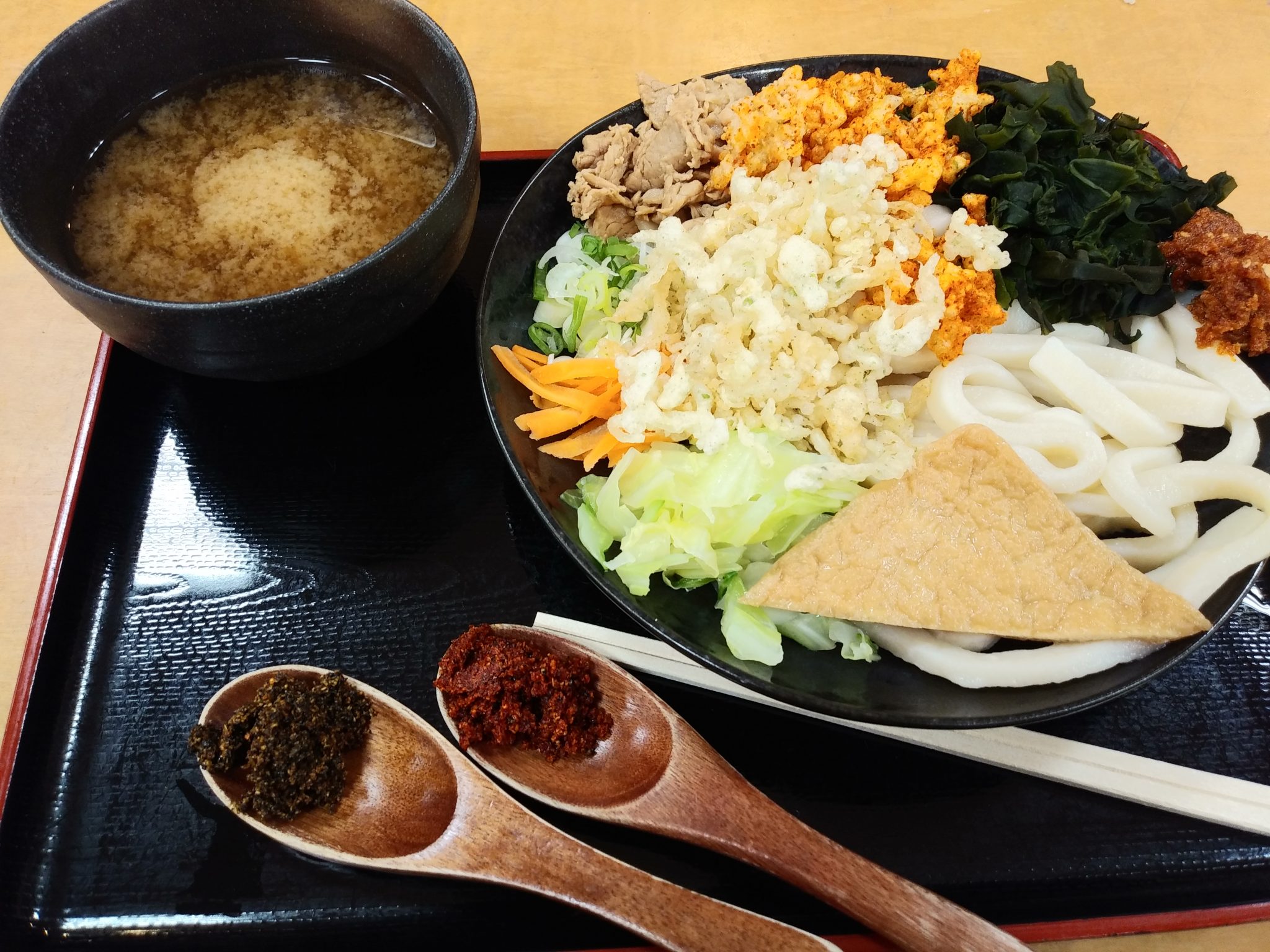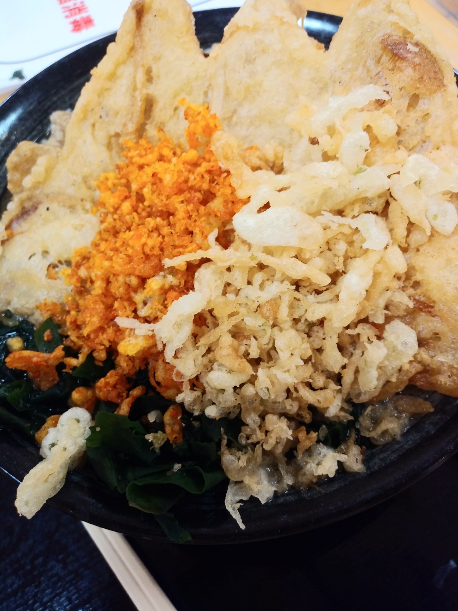 無料トッピングの七味の天かす、天かす、揚げ玉が嬉しい。