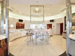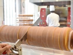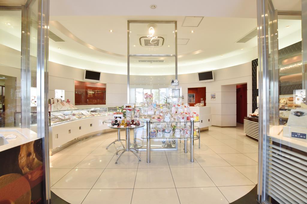 店内に入るとガラス窓の奥でパティシエがエレンバウムを焼く姿が見え、お菓子の香りに優しく包まれる。