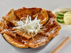 丼からはみ出るほどのボリューム満点な厚切り肉に、たっぷりかかった自家製ダレがたまらない!