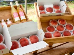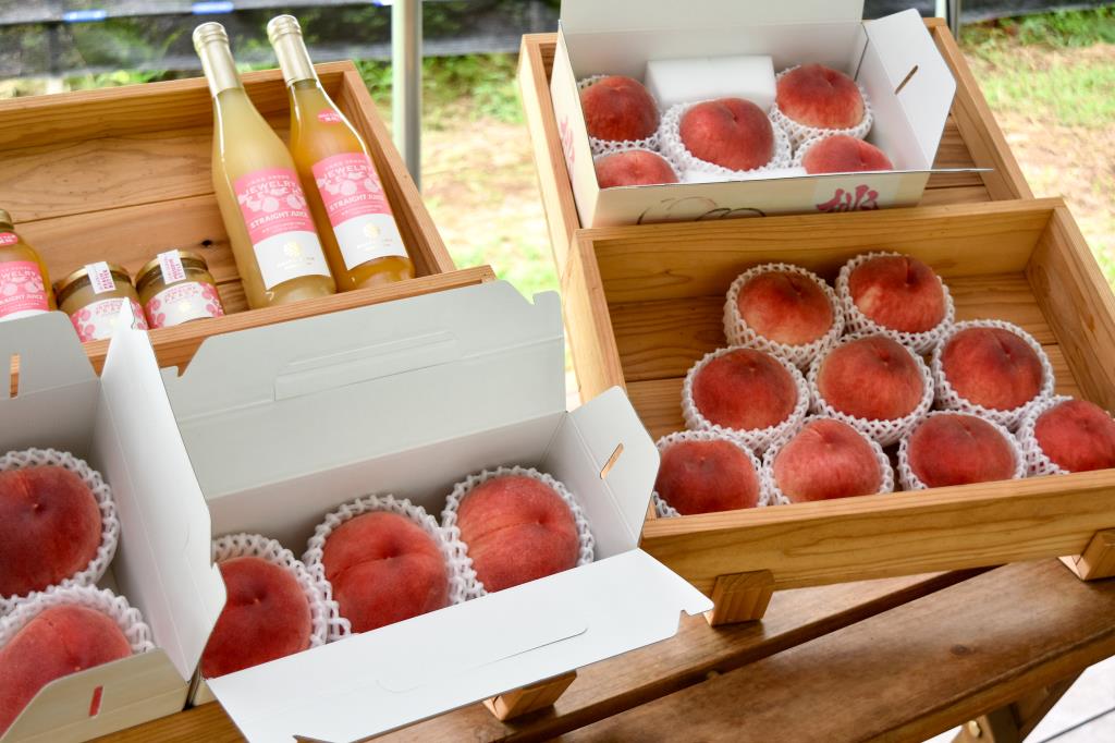 外には自由に使えるテーブルやイスが置いてあるので、自然の中で飲食をすることができる。緑が眩しい桃畑の中でのんびりくつろいでみては。また店内では採れたての桃(ジュエリーピーチ)やジャムなどの販売や発送も行っているので、お土産にもどうぞ!