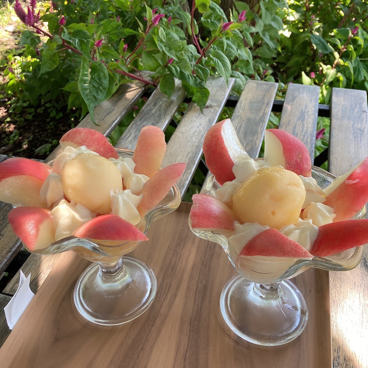 フレッシュ桃とゴルゴンゾーラのピザと桃の冷製パスタ、桃のスムージー、桃パフェを食べました。とにかく桃の美味しいこと!さすが農園フードと感激しました。桃の木の下で食べるという、開放感溢れるロケーションも最高で、山梨ならではのカフェですね。