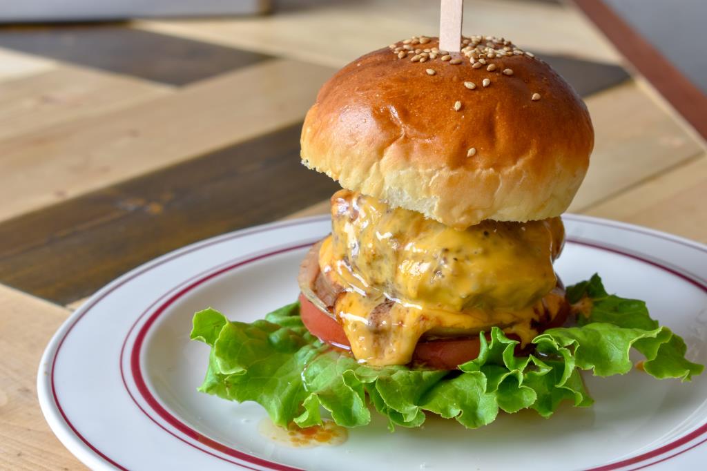 こだわりのハンバーガーは甲州ワインビーフ100%、バンズは特注!