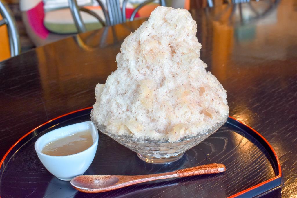 フワフワ食感の氷の中には優しい甘さの塩アイスが入っているので濃厚な桃とのハーモニーが美味しい。