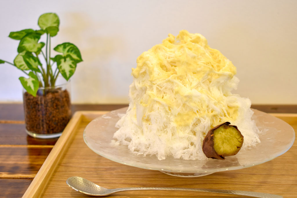 夏は手作りの果物生シロップや焼き芋など珍しいソースのかかったふわふわ食感のカキ氷を楽しめる。