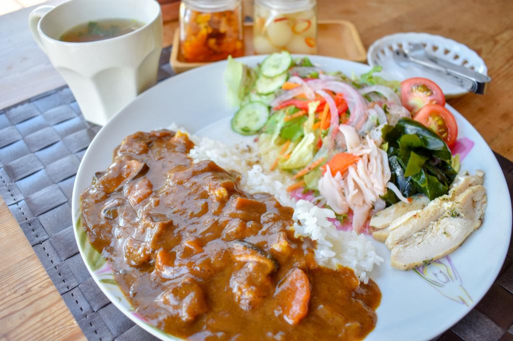 カフェでは、季節の野菜、果物を使用したカレーやスイーツを。