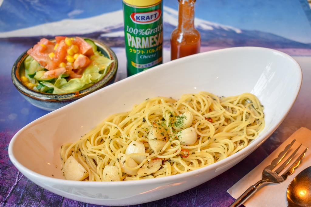 パスタ、ピザ、パフェなどの昔ながらの喫茶メニューに加え、和定食やうどんなど幅広いメニューを豊富に取り揃える。