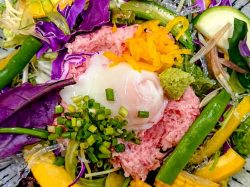 山梨県産の甲州富士桜ポークのとんかつや、炭火で丁寧に焼いた新鮮な地鶏焼きとりが絶品!