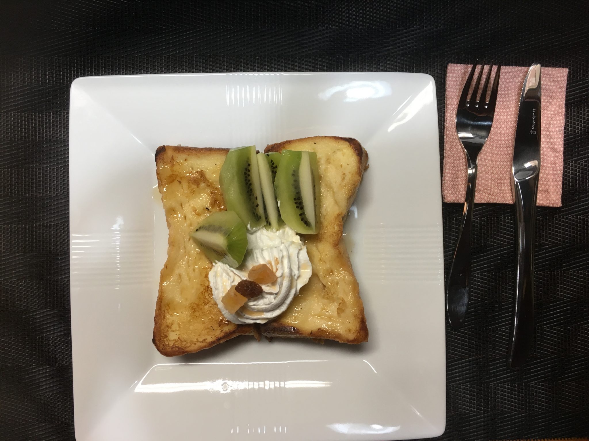 食べたのはフレンチトーストとコーヒー。まずはコーヒー頂きましたが食器にドリップ式でのコーヒー。フレンチトーストは果物が乗っていて、ふわふわで、ほんのり甘くて、とても美味しかったです。