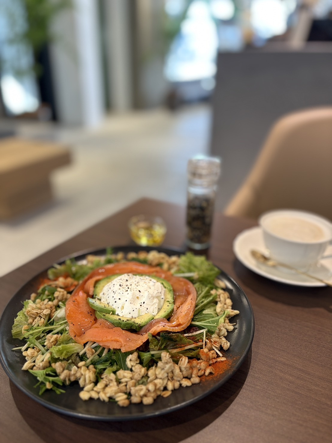 いつもご愛顧頂きありがとうございます✨️ 本日おすすめはグリークヨーグルトプレートです♡ お写真のメニューはサーモンサラダ🍣 他にもお味は生ハムサラダもございます😊 お仕上げはオリ...
